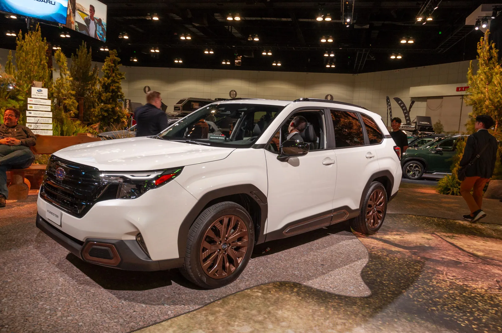 The 2025 Forester Sport costs $35,890 and flashes 19-inch wheels trimmed in bronze, some chrome and bronze badging inside and out, and a $1,700 option that adds Harman Kardon audio, and a couple of drive modes. For that sporting vibe, the Sport also has paddle shifters that mimic an 8-speed automatic.
