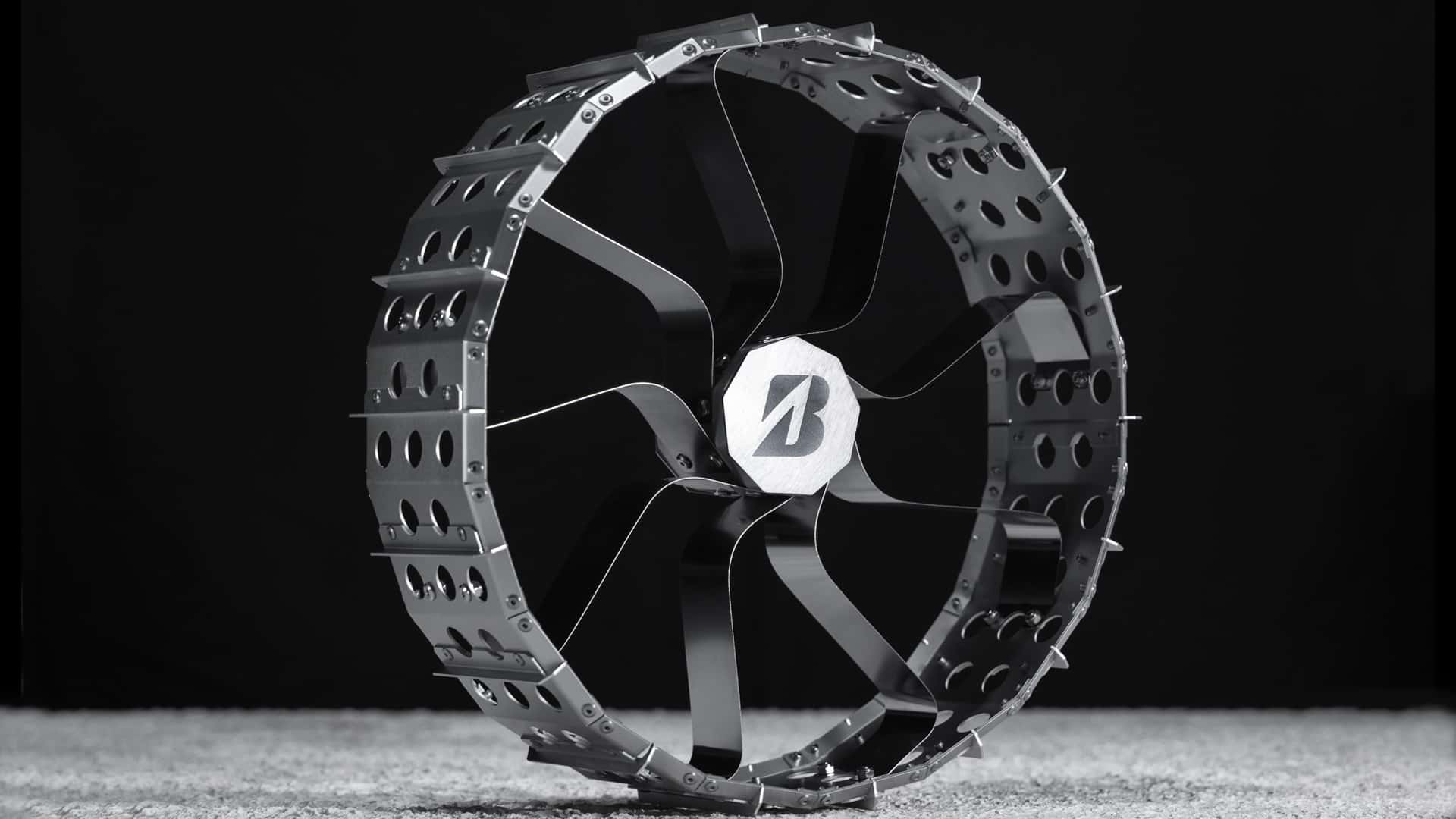 Bridgestone’s solution is to create a metal tire with “tread” on the outside and flexible support structures basically serving as the wheel. The concept on the lower left is designed for smaller rovers that weigh less, hence the fewer number of spokes. The tire on the right is aimed at medium-sized rovers that might wander into rougher terrain. Bridgestone says it balances weight and with durability and capabililty.