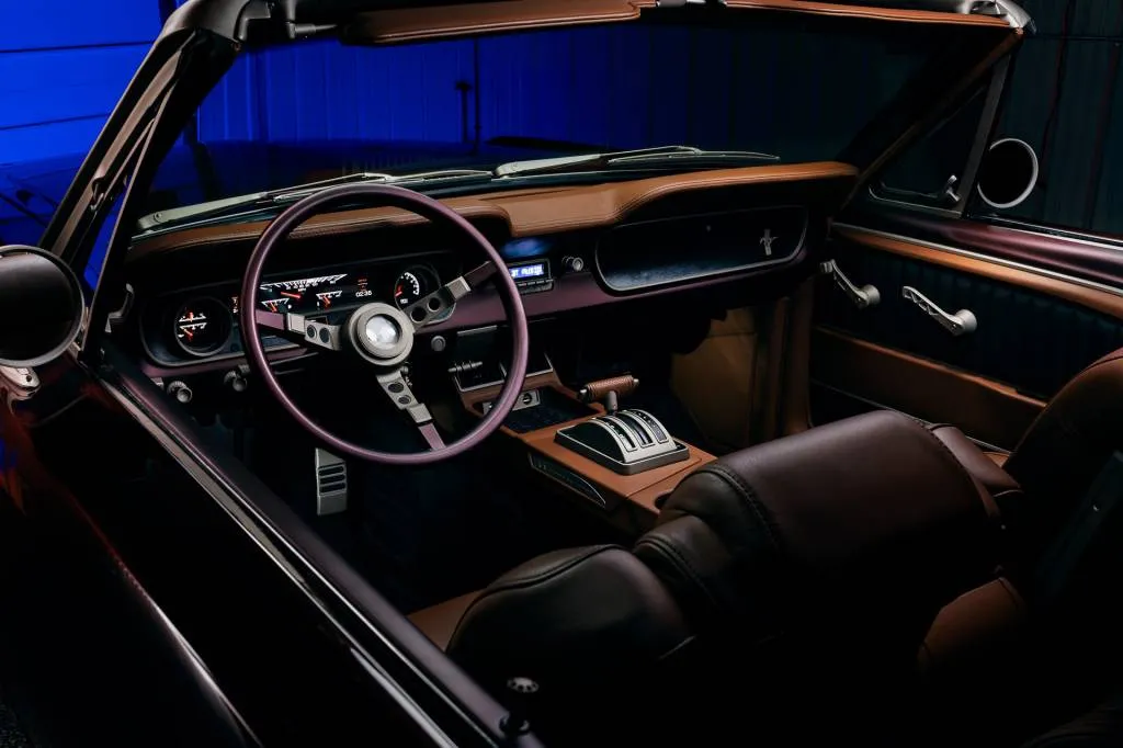 The interior was designed by a company called Sean Smith Designs and features leather trim installed by Upholstery Unlimited. The gauges come from Dakota Digital, while the steering wheel is a custom design that Ringbrothers said pays homage to the original Mustang’s interior.
