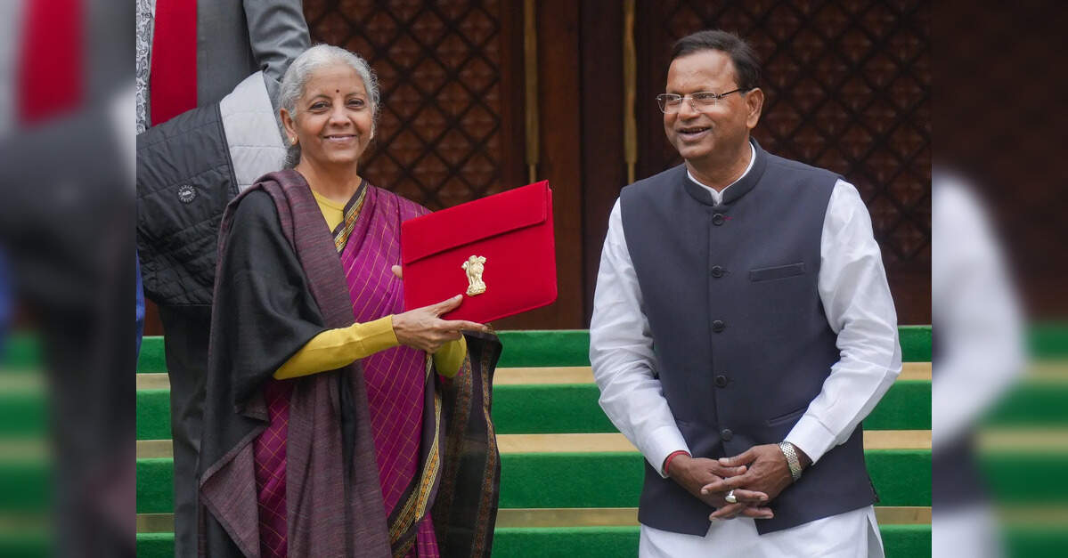 New Delhi: Finance Minister Nirmala Sitharaman shows the digital tablet, enclosed in a traditional red bahi-khata style pouch, at the…